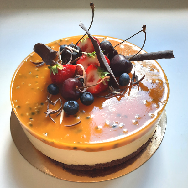 Peal kerge grenadilli zelee, sees mango-toorjuustu sisu ning põhjas brownie biskviit. koostisosad- toorjuust, vahukoor, mangopüree, zelatiin, suhkur, grenadilli püree