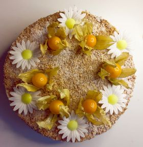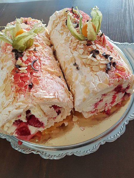 koostisosad- munavalge, tärklis, suhkur, veiniäädikas, passioni kreem, toorjuustu-vahukoore kreem, värsked marjad (kaunistused sõltuvad hooajast)